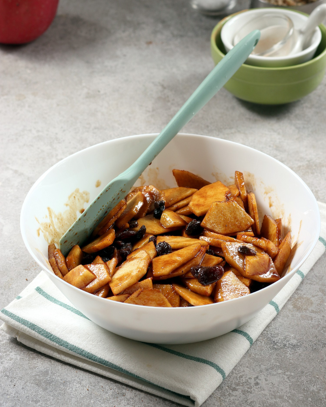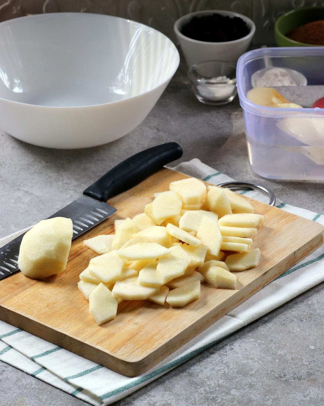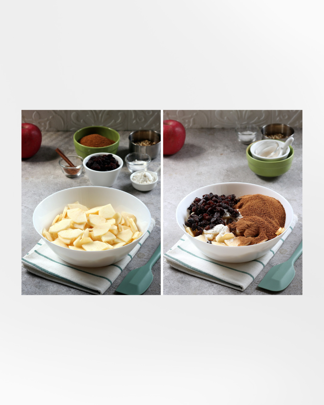 1. Siapkan isian apel. Kupas apel, buang bagian bijinya, kemudian iris tipis. Campurkan