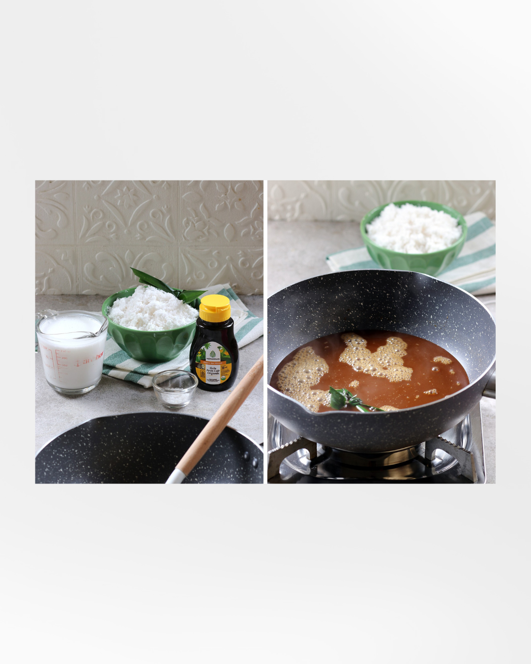 2. Buat sausnya. Rebus santan, gula aren cair Mahorahora, daun pandan dan garam dalam