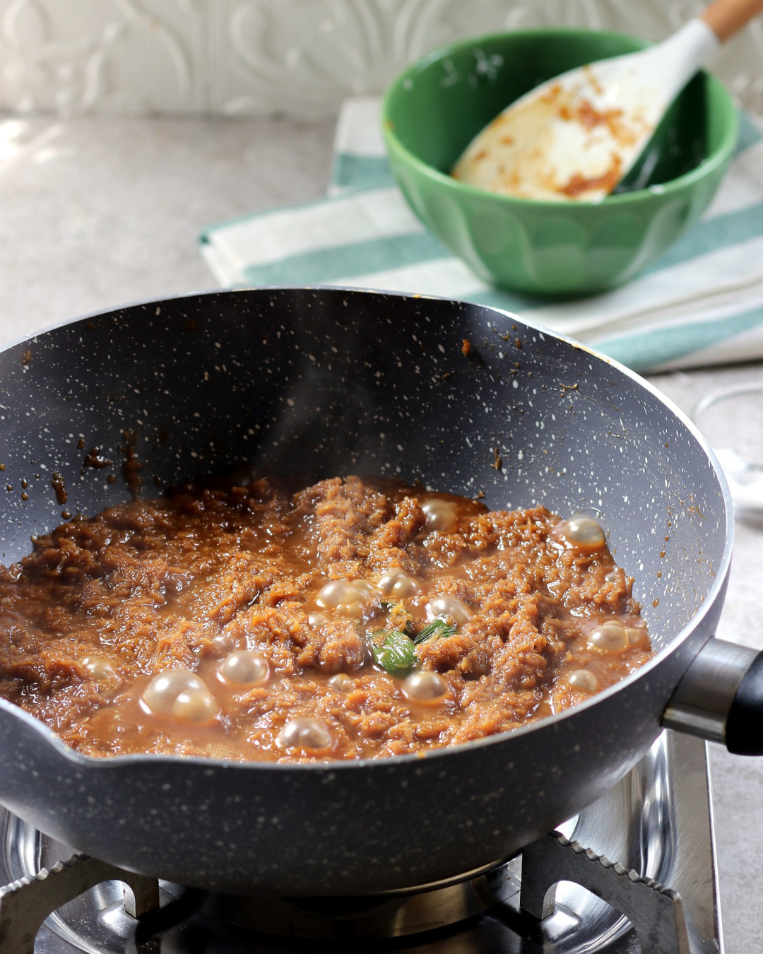 wajan hingga mendidih lalu tambahkan kelapa parut, kecilkan api kompor. Sesekali diaduk