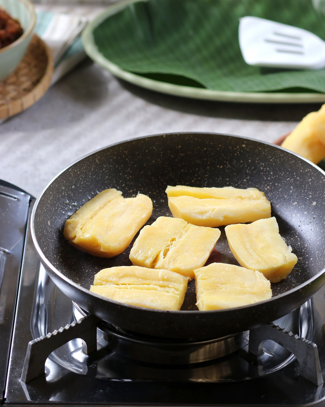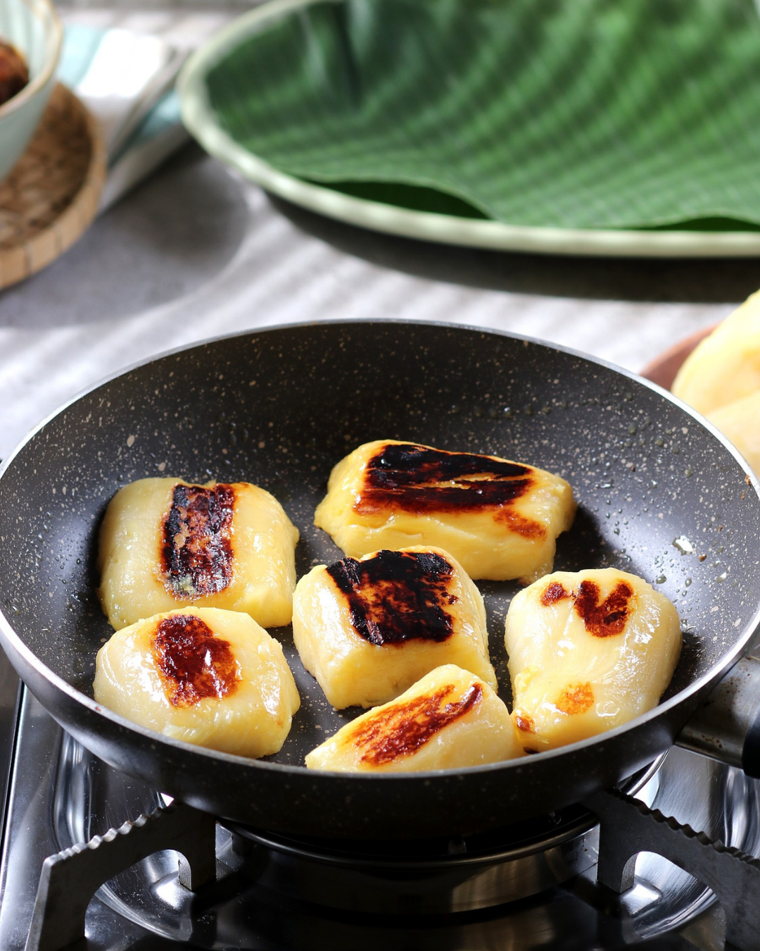 1. Oleskan mentega di wajan datar. Bakar tape di atasnya hingga matang di kedua sisinya.