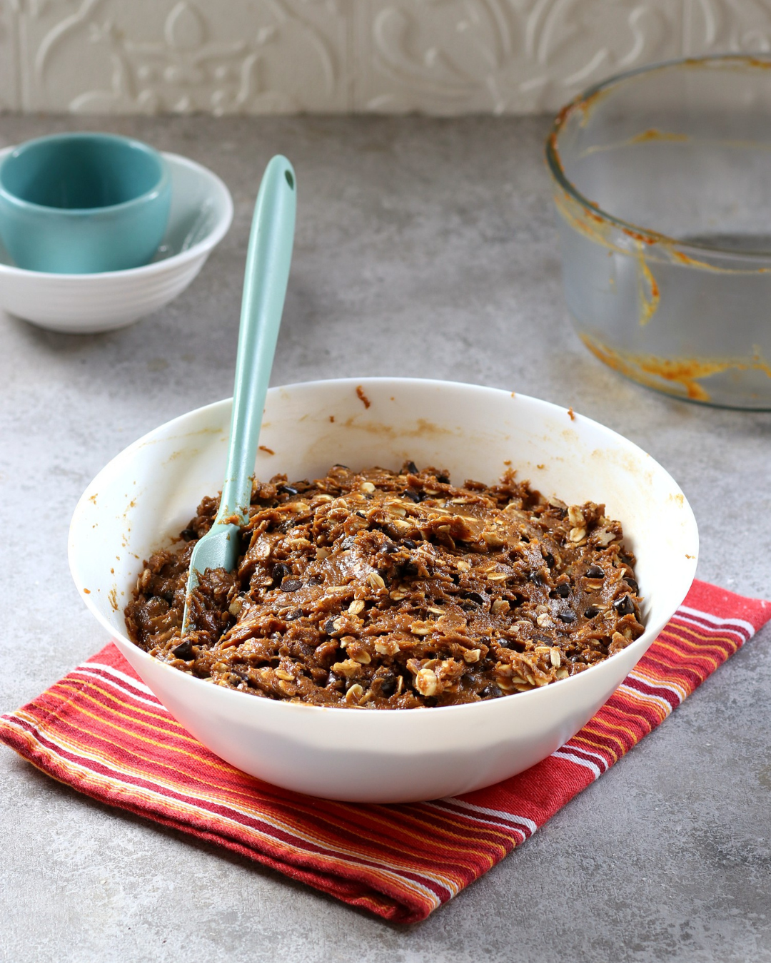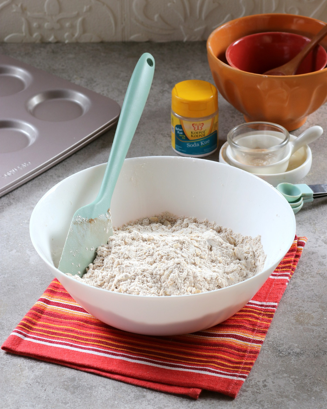 bubuk, garam dan oat dalam mangkuk besar. Sisihkan.