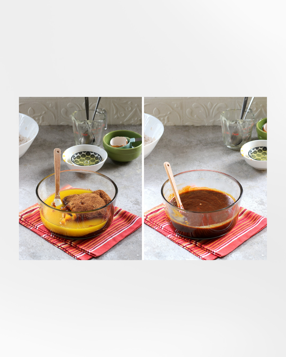 3. Campurkan mentega leleh, maple syrup, gula bubuk Mahorahora, kuning telur dan pumpkin