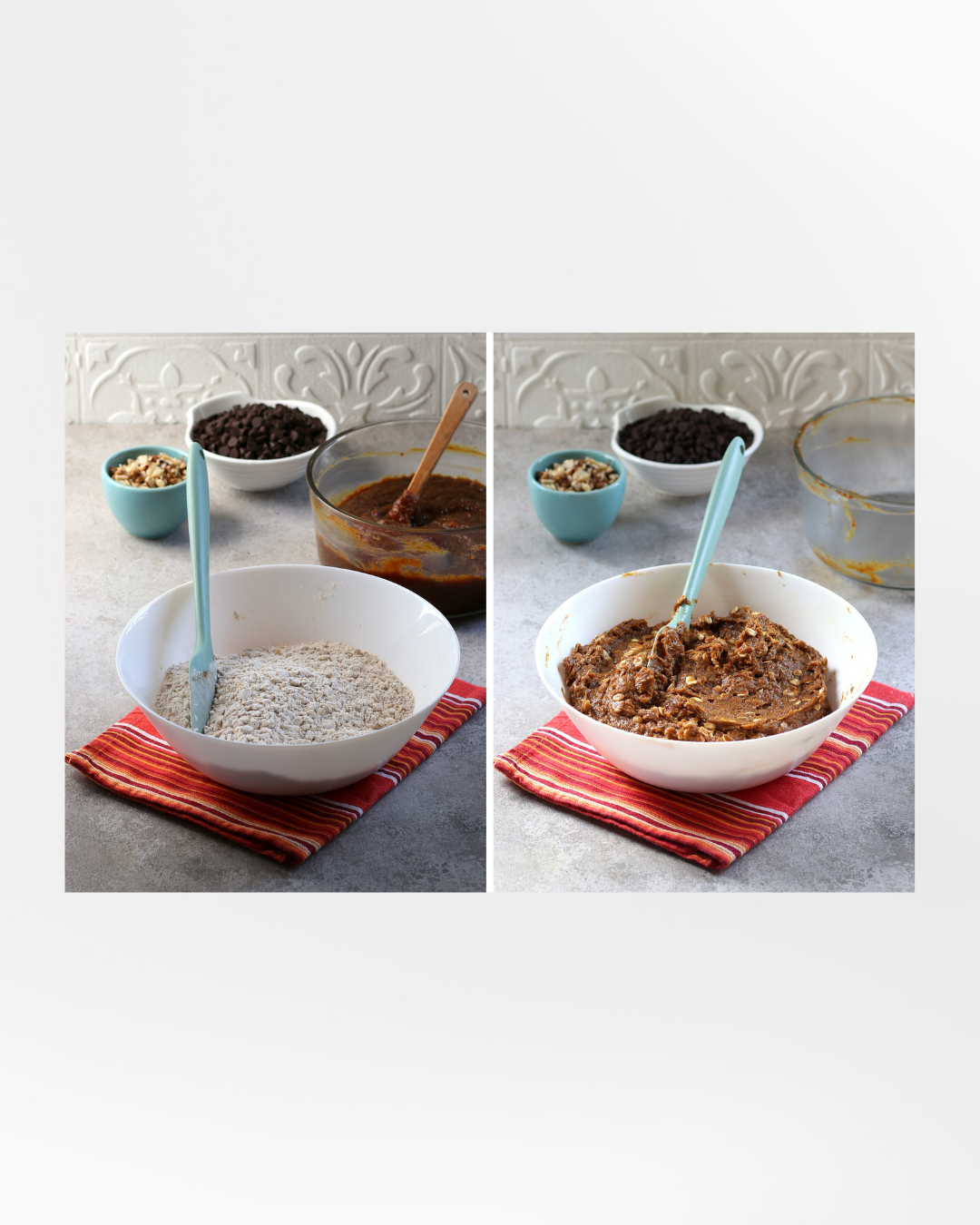 Masukkan chocolate chips dan cacahan kacang walnut. Aduk hingga tercampur rata.