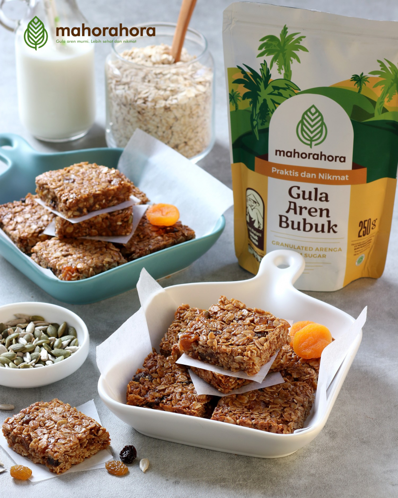 Halo Sahabat Mama Hore! Ketemu lagi di #ResepWeekendMamaHore yang kali ini menampilkan resep Sticky Fruit Oat Slices dengan Gula Aren Mahorahora