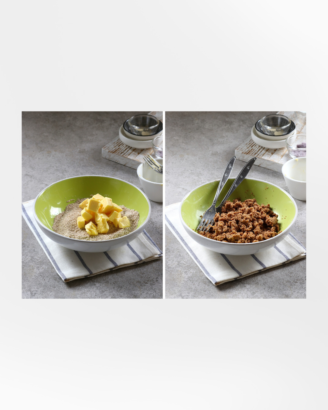mentega tawar dingin yang telah dipotong kotak kecil. Campurkan menggunakan garpu,