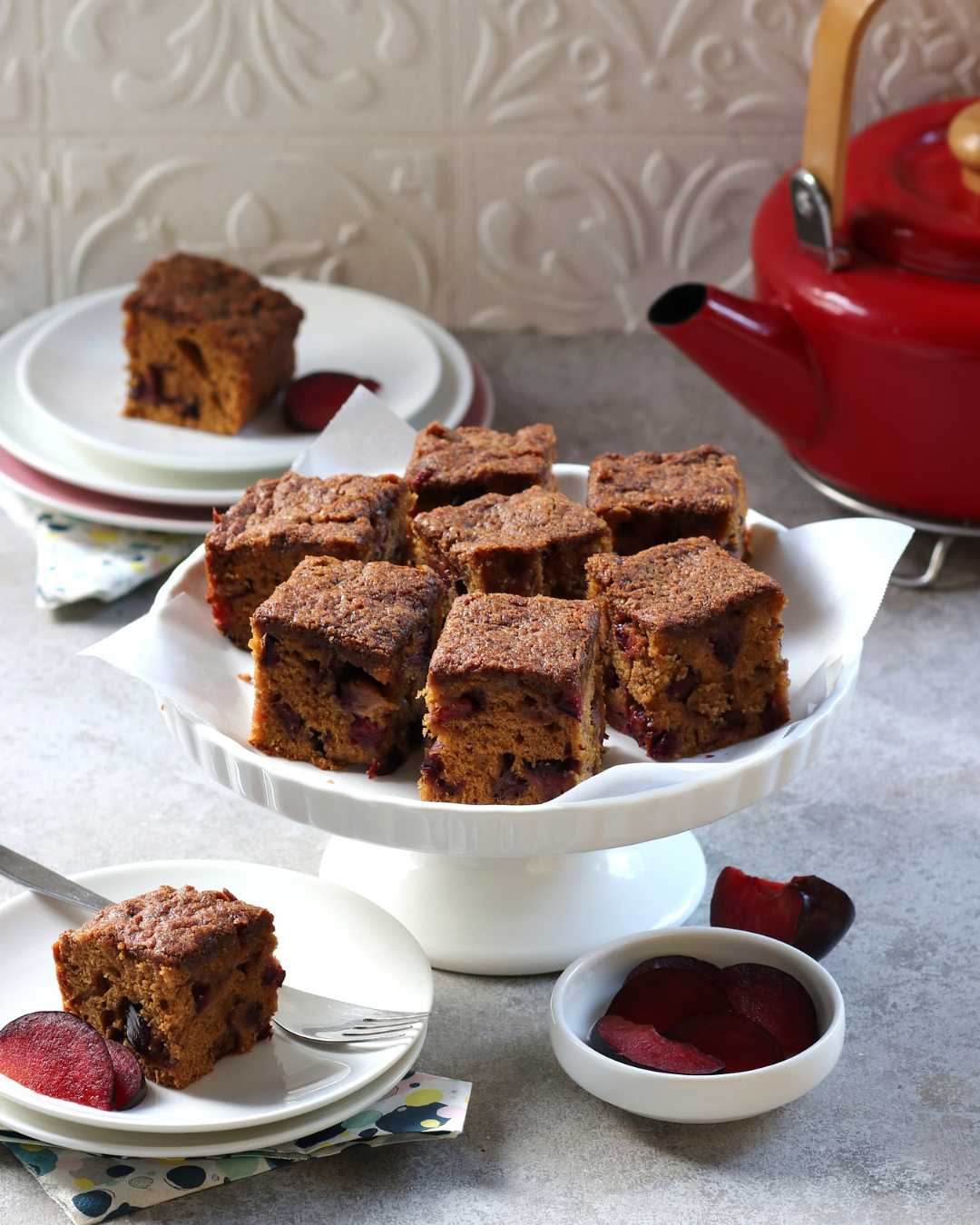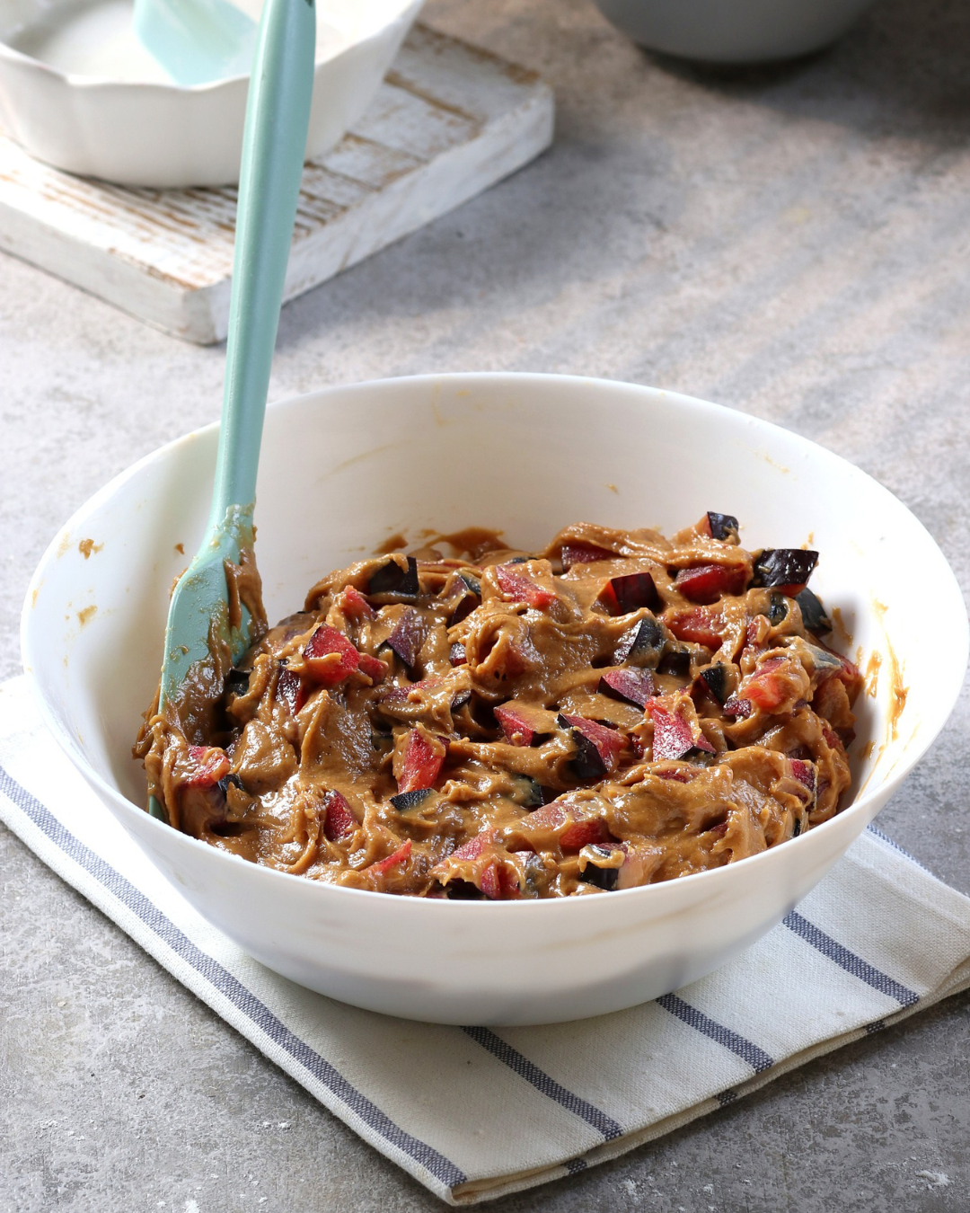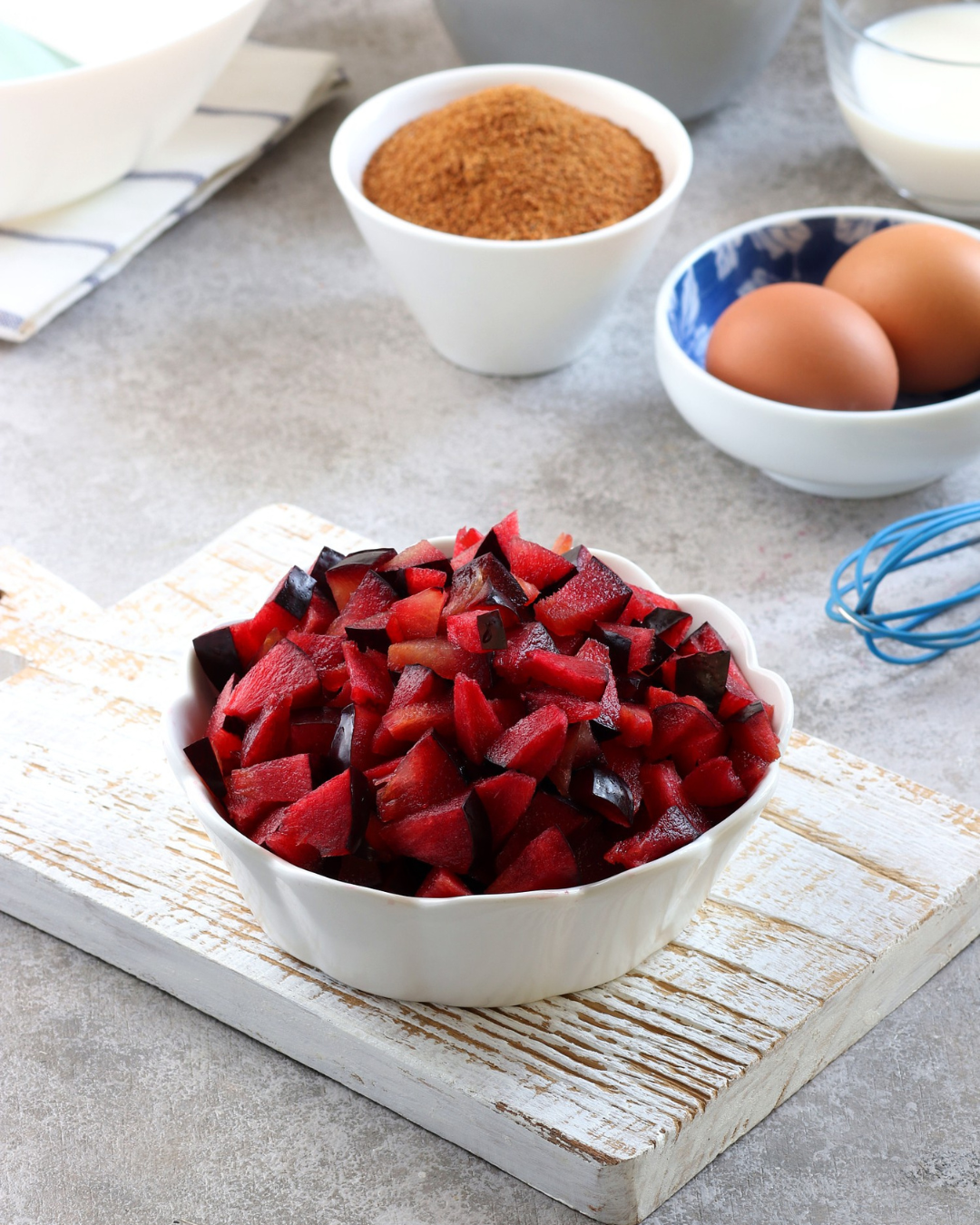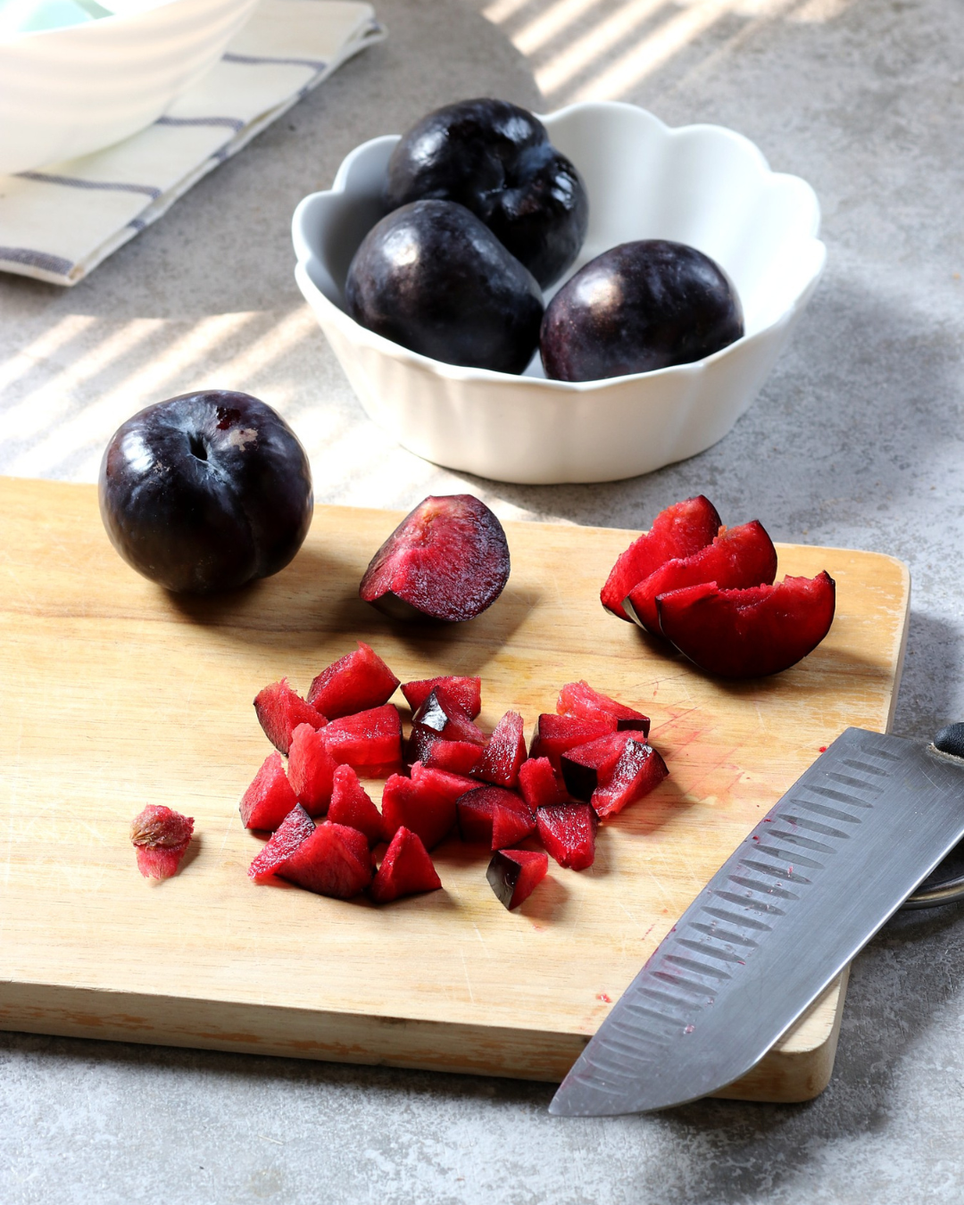 Belah setiap buah plum menjadi dua bagian, keluarkan bijinya. Belah setiap ½ buah plum