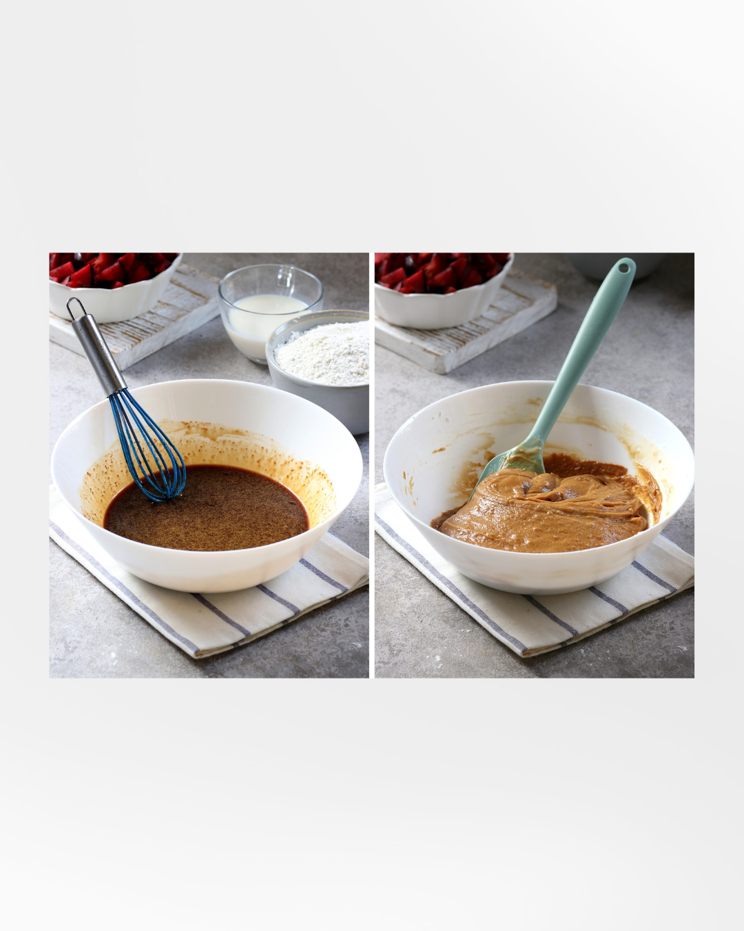 Campurkan mentega leleh, gula aren bubuk Mahorahora dan putih telur dalam mangkuk